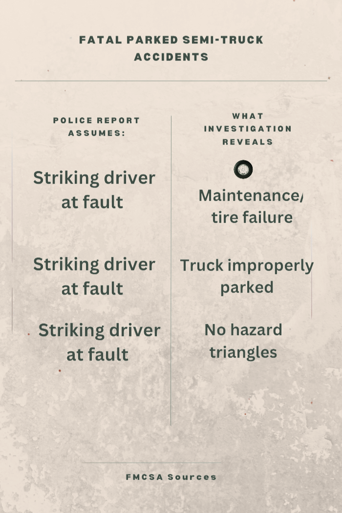 In this case, the truck driver claimed he had pulled over due to a flat tire, which initially appeared to be a legitimate emergency. However, our investigation revealed that this ā€œemergencyā€ was entirely preventable. The tire had been under-inflated for months, gradually weakening its structure until failure was inevitable. This wasn’t a sudden emergency: it was the predictable result of the trucking company’s failure to maintain its vehicle properly. The company had ignored basic maintenance requirements, ultimately creating conditions that would force its driver to park in a dangerous location.